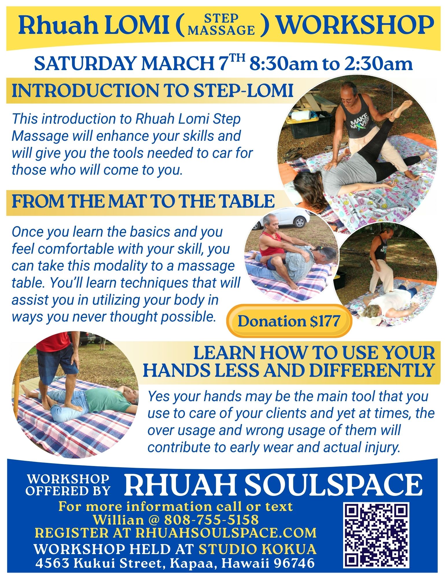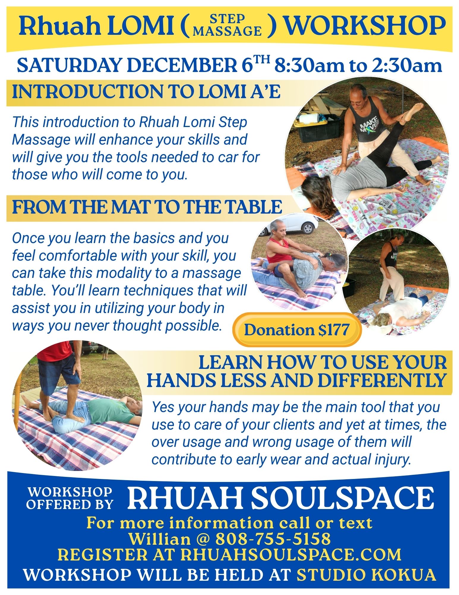 Rhuah Lomi Step Massage Workshop Name(Required) First Last Email(Required) Enter Email Confirm Email phone number(Required)Leave a coment if you likeDonation type(Required) I will donate at workshop $50 Hold my spot (non-refundable deposit) Full donation Aloha and thank you for your interested on this work This content is restricted to site members. If you are an existing user, please log in. New users may register below.Existing Users Log InUsername or EmailPassword Remember Me New User RegistrationChoose a Username*First Name*Last Name*Phone*Email*Confirm Email*City*State*Country*Choose Interest* Personal Mentoring Business MentoringBiographical InfoPassword*Confirm Password**Required field